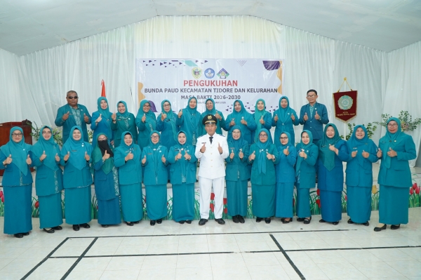 TIDORE, OT- Ketua Tim Penggerak PKK Kota Tidore Kepulauan Rahmawati Muhammad Sinen resmi melantik Ketua Tim Penggerak PKK Kecamatan Tidore Marliyani Sahril yang dirangkaikan dengan Pengukuhan Bunda PAUD Kecamatan Tidore dan Kelurahan se Kecamatan Tidore masa bakti 2026- 2030, yang berlangsung secara khidmat di Aula Kantor Camat Tidore, Selasa (20/1/2026).