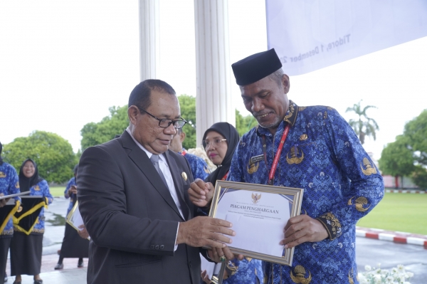 TIDORE, OT- Upaya memberikan motivasi terhadap kinerja Aparatur Sipil Negara (ASN), Pemerintah Kota Tidore Kepulauan memberikan penghargaan kepada pemenang lomba inovasi daerah Kategori OPD, RSD, Bagian dan Kecamatan di Lingkup Pemerintah Kota Tidore Kepulauan usai pelaksanaan upacara HUT ke 54 KORPRI dihalaman kantor Wali Kota Tidore, Senin (1/12/2025).