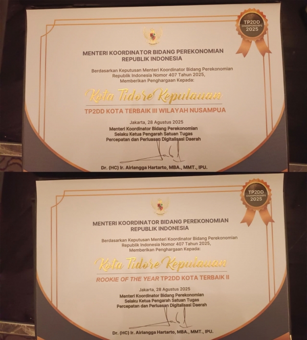 TIDORE, OT- Pemerintah Kota Tidore Kepulauan raih 2 penghargaan sekaligus dari Menteri Koordinator Bidang Perekonomian Republik Indonesia atas capaian dan kinerja Tim Percepatan dan Perluasan Digitalisasi Daerah (TP2DD). Penghargaan yang diraih Kota Tidore yaitu TP2DD Kota Terbaik III Wilayah Nusampua dan Rookie of The Year TP2DD Kota Terbaik II untuk Kawasan Nusa Tenggara- Maluku- Papua.