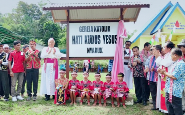 KALBAR, OT - Bupati Sekadau, Aron didampingi oleh ketua TP. PKK kabupaten Sekadau Ny. Magdalena Susilawati Aron,SP meresmikan pengunaan Gereja Hati Kudus Yesus Stasi Nyabuk Paroki Nanga Taman Keuskupan Sanggau, Sabtu, (19/09/2022) di Nyabuk.