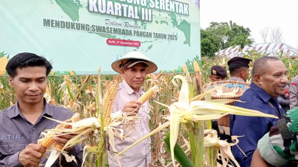 TIDORE, OT- Wali Kota Tidore Kepulauan yang diwakili oleh Asisten Sekda Bidang Perekonomian dan Pembangunan Taher Husain menghadiri Panen Raya Jagung Serentak Kuartal III dalam rangka mendukung Swasembada Pangan Tahun 2025 di Desa Ake Kolano, Kecamatan Oba Utara, Kota Tidore Kepulauan, Sabtu (27/9/2025).