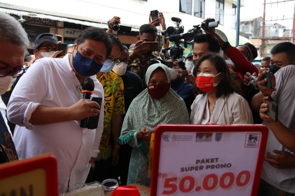 “Kami meninjau pasar kali ini, salah satunya untuk memastikan harga minyak goreng, serta harga beras dan gula pasir yang tergolong cukup murah,” kata Airlangga Hartarto.
