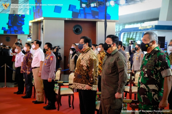 Dalam konteks sinergisme Pemerintah dengan seluruh stakeholders, Menteri Koordinator Bidang Perekonomian Airlangga Hartarto bersama sejumlah menteri lainnya, menghadiri acara peluncuran Aplikasi Monitoring Karantina Presisi di Terminal 3, Bandara Soekarno-Hatta, Tangerang-Banten, Kamis (6/01/2022).