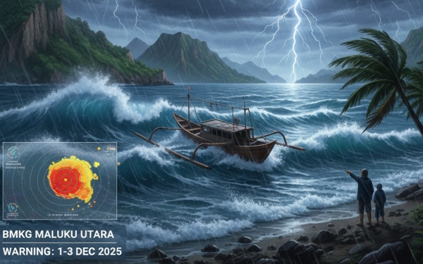 TERNATE, OT – Badan Meteorologi, Klimatologi, dan Geofisika (BMKG) Stasiun Meteorologi Kelas I Sultan Baabullah Ternate telah mengeluarkan Peringatan Dini Cuaca untuk wilayah Maluku Utara yang berlaku selama tiga hari, mulai hari ini, Senin, 1 Desember hingga Rabu, 3 Desember 2025.