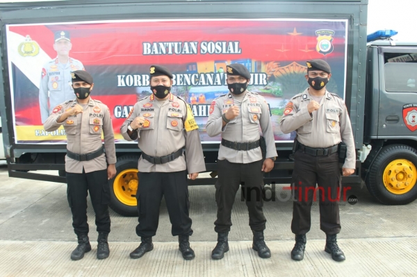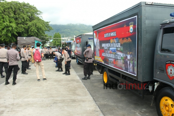 TERNATE, OT - Kepolisian Daerah (Polda) Maluku Utara, (Malut), Senin (18/1/2021) menyalurkan bantuan sembako untuk masyarakat terdampak bencana alam di Kabupaten Halmahera Utara (Halut).