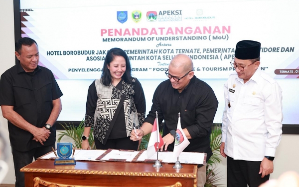 Kerjasama tersebut ditandai dengan penandatanganan Memorandum of Understanding (MoU) oleh Wali Kota Ternate, Dr H M Tauhid Soleman, Sekretaris Dewan Pengurus (Direktur Eksekutif APKSI), Alwis Rustam bersama perwakilan GM Hotal Borobudur, Linda Damayanti, pada Rabu (1/4/2026).