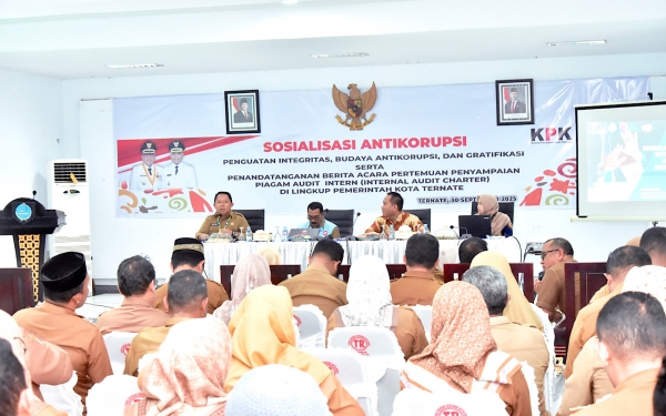 TERNATE, OT - Komisi Pemberantasan Korupsi (KPK) melalui Bidang Pendidikan dan Peran Serta Masyarakat bersama Pemerintah Kota Ternate menggelar sosialisasi anti korupsi di aula lantai I Kantor Wali Kota, Selasa (30/9/2025).